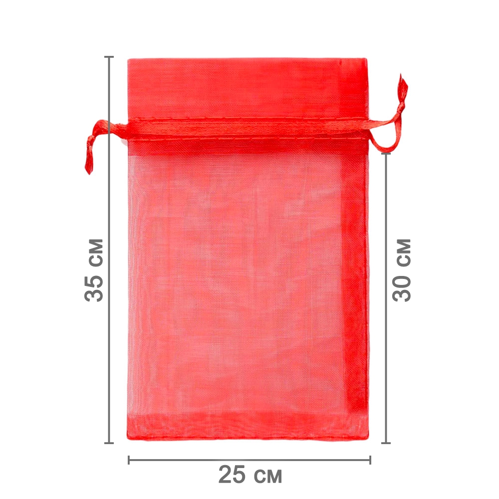 Мешочек из органзы 25 х 35 см — практичный аксессуар для упаковки крупных предметов и подарков. Лёгкая ткань подчёркивает содержимое и придаёт праздничный вид.