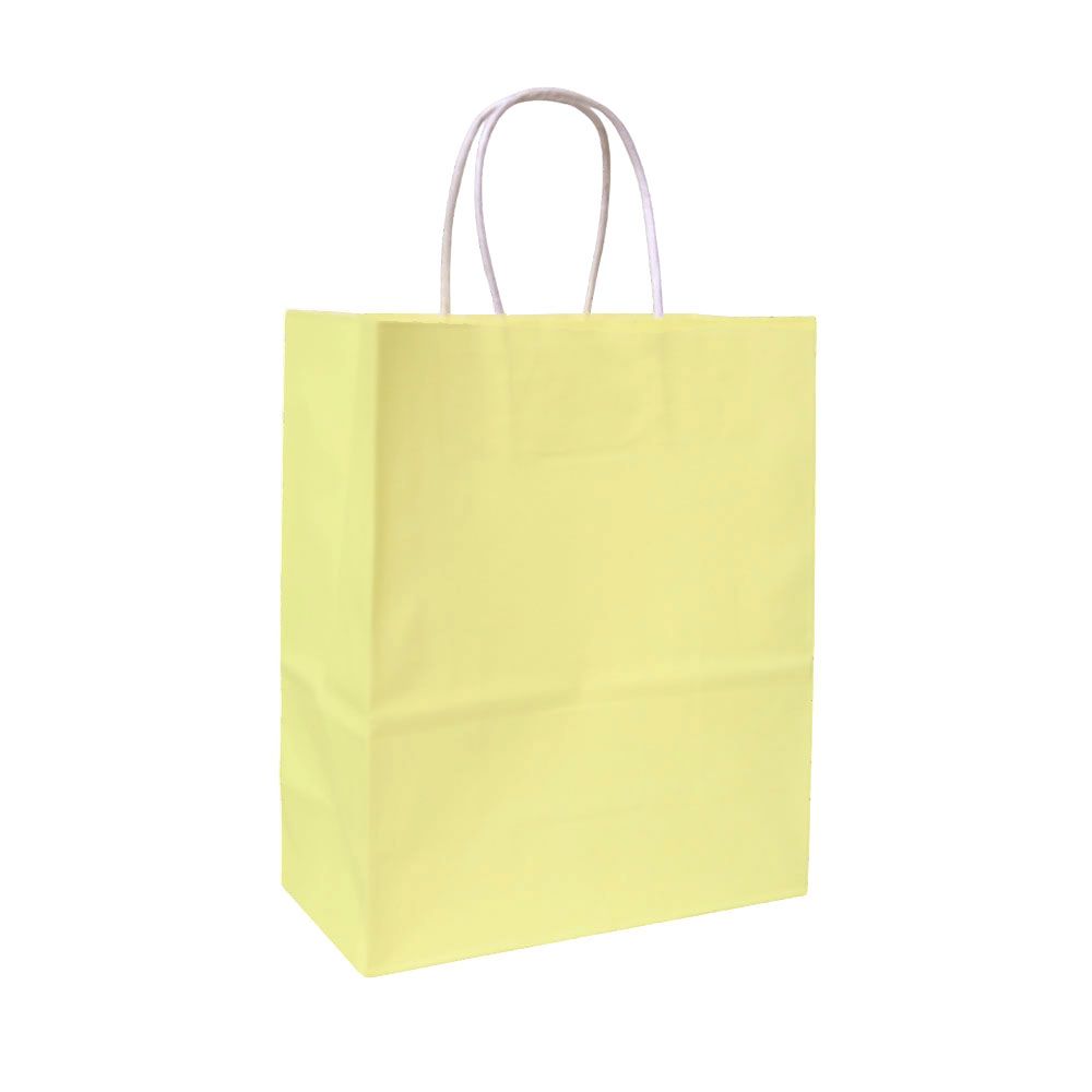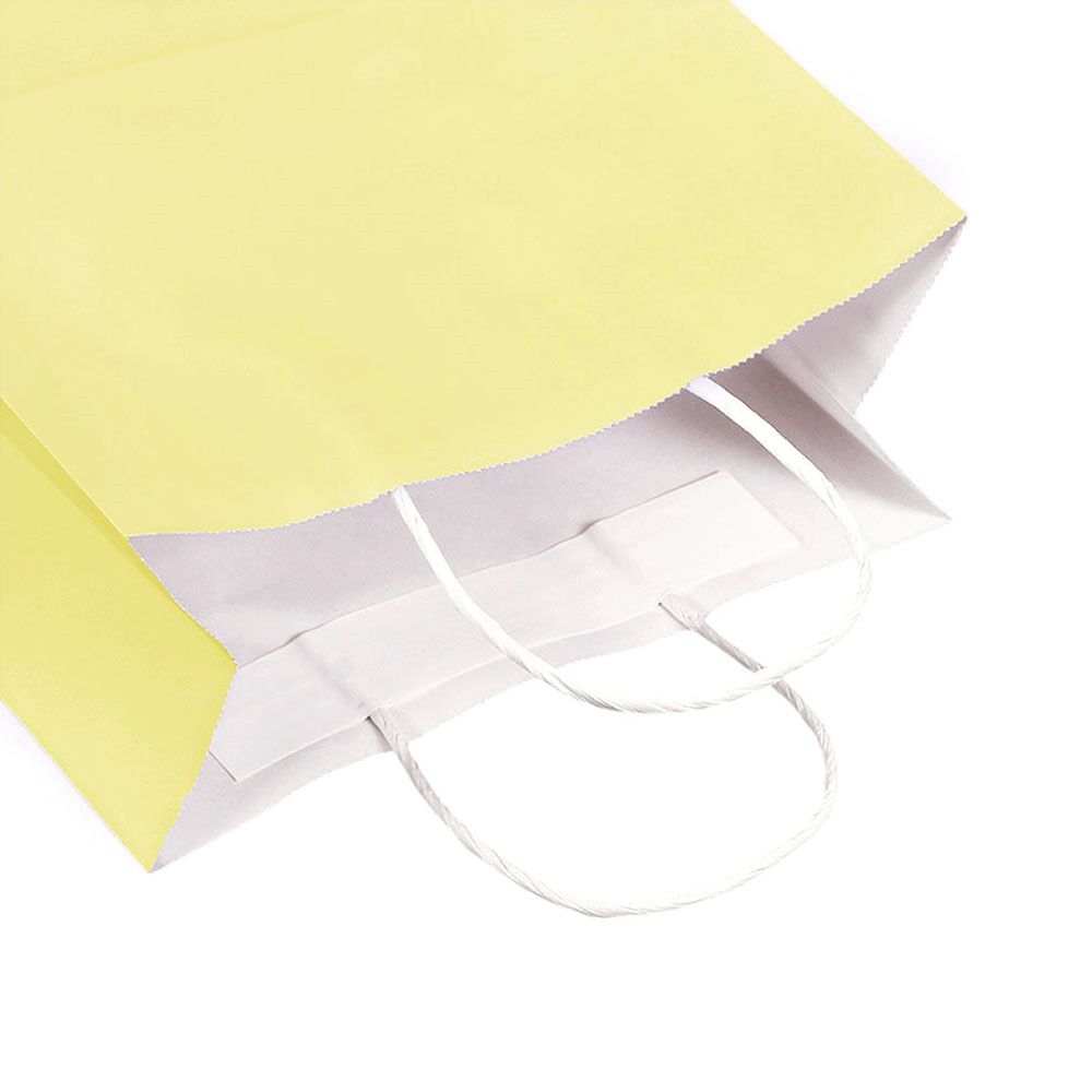 Подарочный пакет из крафтовой бумаги пастельного оттенка с белыми бумажными ручками и белой внутренней стороной.