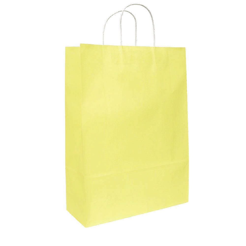 Подарочный пакет из крафтовой бумаги пастельного оттенка с белыми бумажными ручками и белой внутренней стороной.