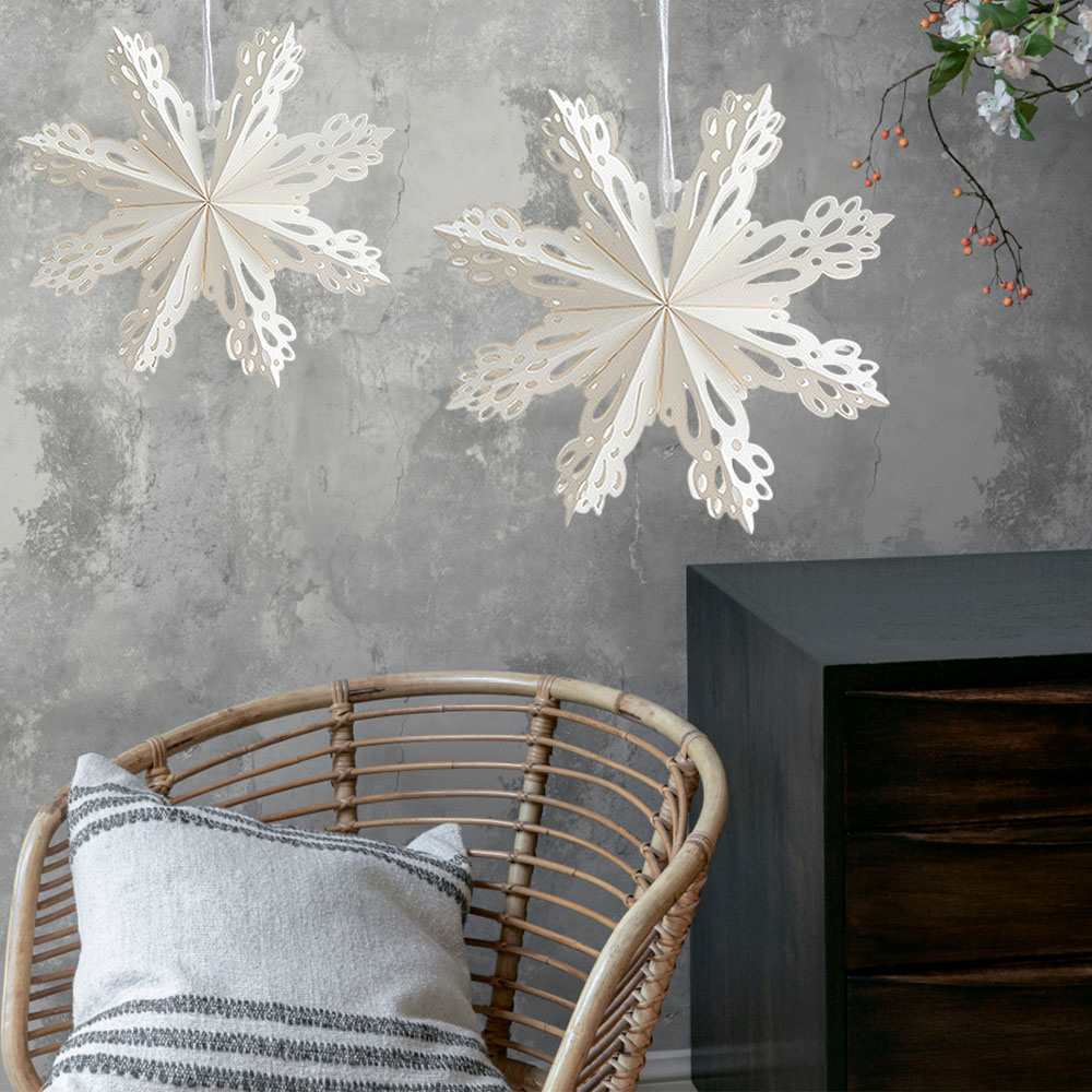 Элегантная объёмная снежинка из плотной бумаги белого цвета — изысканное украшение для зимнего интерьера, витрин, залов и новогодних фотозон. Ажурный рисунок придаёт ей лёгкость и воздушность, создавая ощущение снежной свежести и уюта.